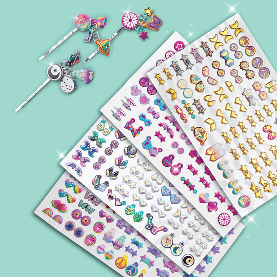 | Agrega un poco de brillo adicional a tu cabello con adornos para el cabello plegables simples, divertidos y bonitos. Simplemente dobla y pega amuletos en tu cabello: ¡son fáciles de poner y quitar! Incluye: 373 pegatinas, 22 anillos metálicos, 3 horquillas y madeja de hilo oropel para el pelo. Escanea el QR del empaque para poder obtener las instrucciones en español. Edad Recomendada: +5 años |